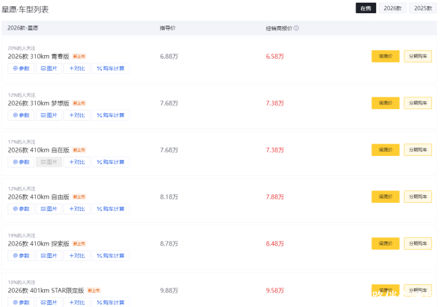 与此同时,为了进一步完善银河星愿的产品力,该车在前段时间推出了2026款车型。从价格上来看,2026款银河星愿的起步价依然是6.88万元,与25款车型的价格保持一致。不过在功能配置上,2026款银河星愿还是有一定的提升。所以说到这里,下面我们就针对新款那银河星愿这款车,看看它的产品表现如何。